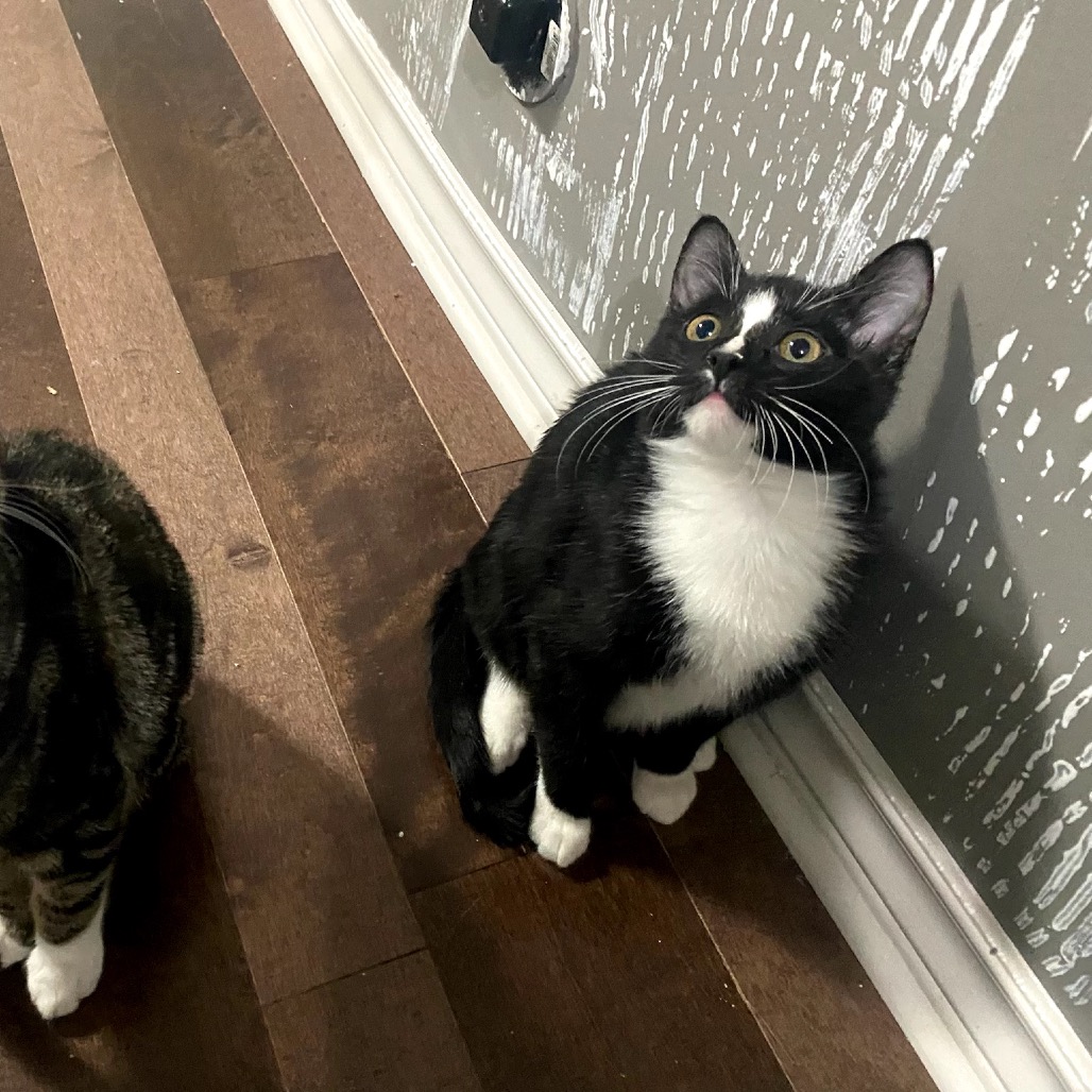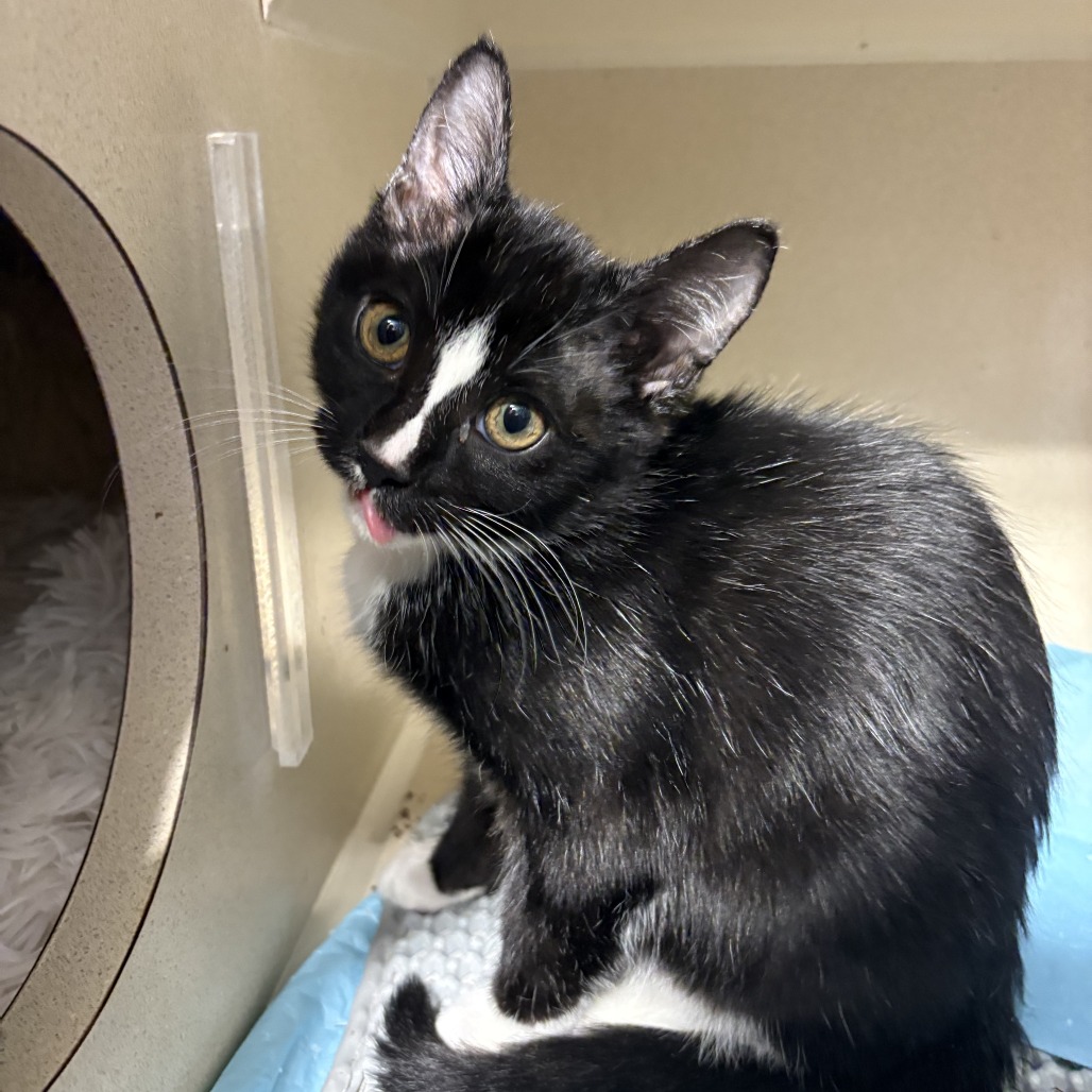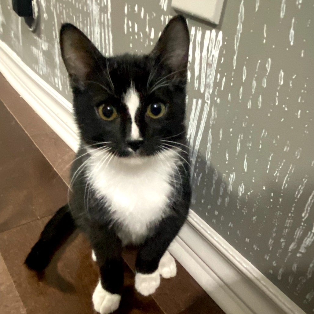 My name is Bento and I came to scars with my mom and siblings back in January. I'm the most playful kitten in our litter and love to chase after toys. I'm always on the go. I'm also nearly twice the weight of my other siblings, despite being shorter - my foster home says I remind them of a fat little potato. I'm getting cuddlier every day, and I really love chin scratches and having my belly rubbed. Even though I'm social, I came in very scared of everything and am still sensitive to high noise or energy levels, so I would prefer a quieter home without young kids, parties, etc. I do still love people, though, and really enjoy a good cuddle. I'm not as into playing with hands as my siblings are, but I would still benefit from consistent reinforcement that this kind of play isn't appreciated. I'll be a very sweet boy when I grow up!