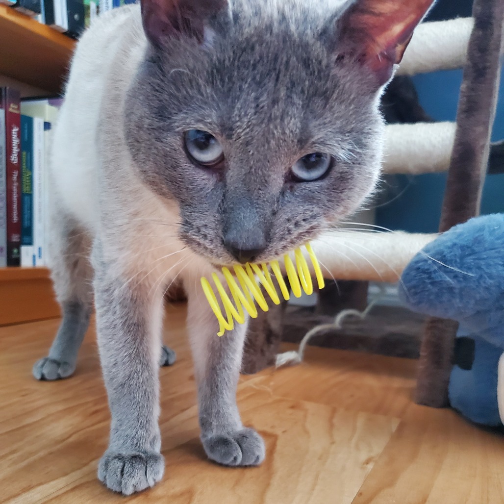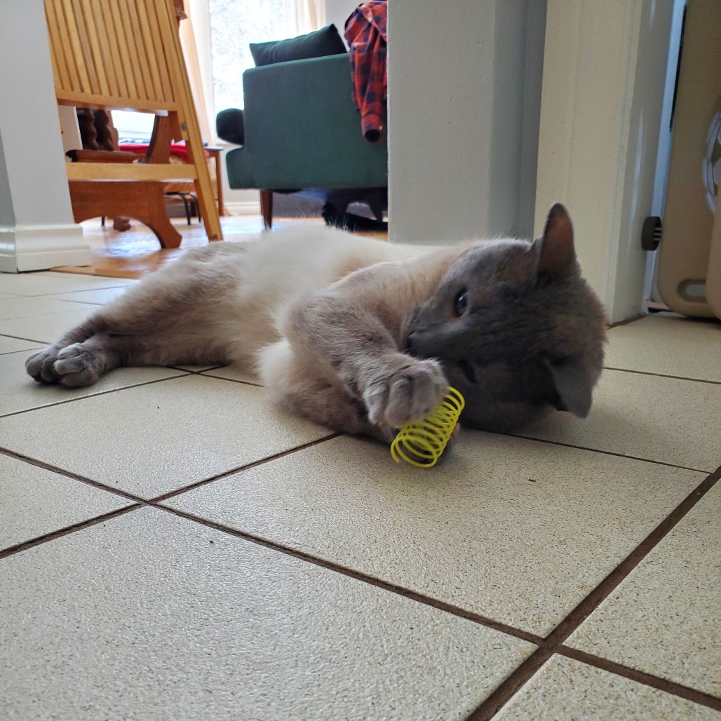 Lately I've been loving catnip toys and little plastic springs. I can scoot around for hours happily chasing my springs, and I have a really cute habit of "talking" to myself while I play!