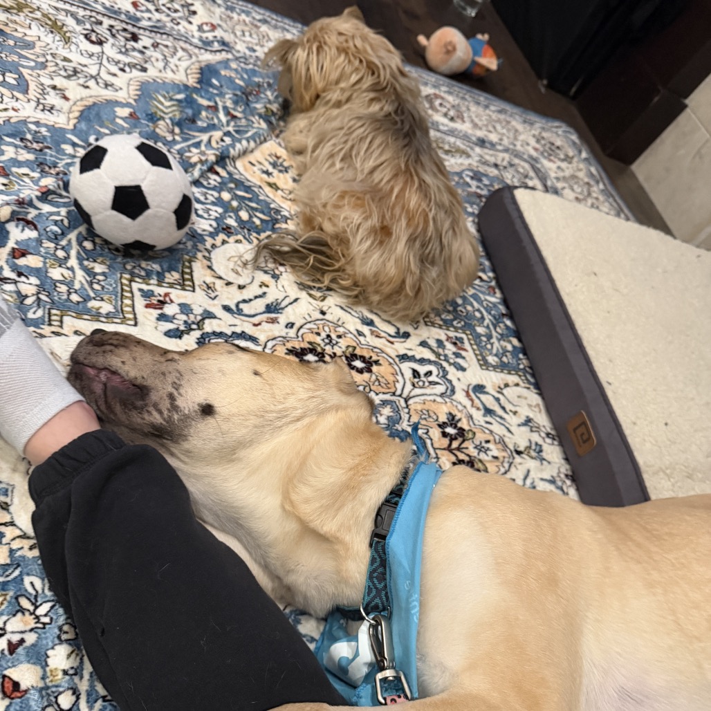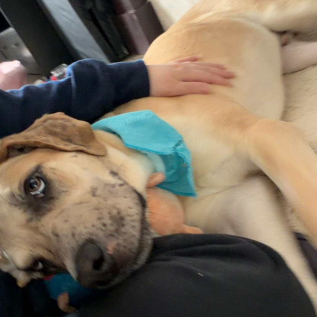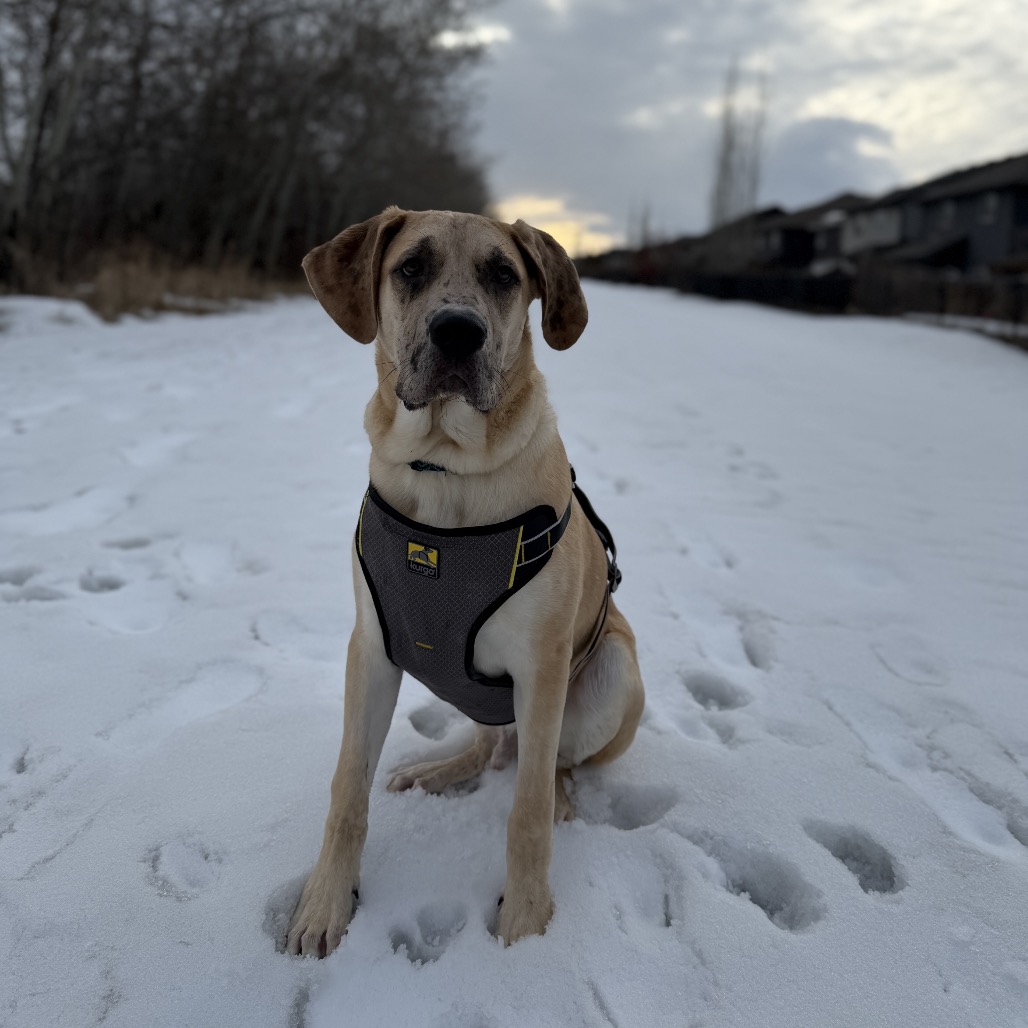 He’s good with kids and has done well with smaller dogs. Because he’s still a growing puppy (and already quite big!), he’d do best with older kids who can handle his size and playful energy. He hasn’t been tested with larger dogs yet.