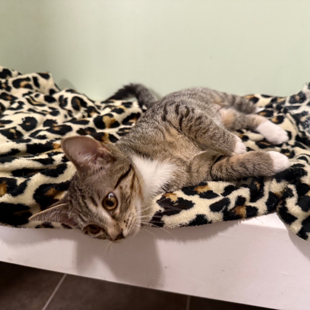 My name is Socks. I’m a young and petite little girl full of playful kitten energy. I also love to snuggle my humans and I’ll follow you anywhere you go. I get the zoomies and keep myself entertained, running around and chasing toys but I’m pretty gentle with my paws. You’re guaranteed to get a laugh or two watching me play. Once I’ve done my daily cardio, next up is snuggle time. I like to get cozy and snuggle as close to you as I can. I’m a sweet and affectionate little girl who’s just happy to see everyone. I haven’t lived with any other cats yet besides my sister, ‘KittyKitty’, but I’m young enough that I should be fine with new friends. Usually kittens like me also learn to get along with dogs as long as they don’t think I’m a snack.