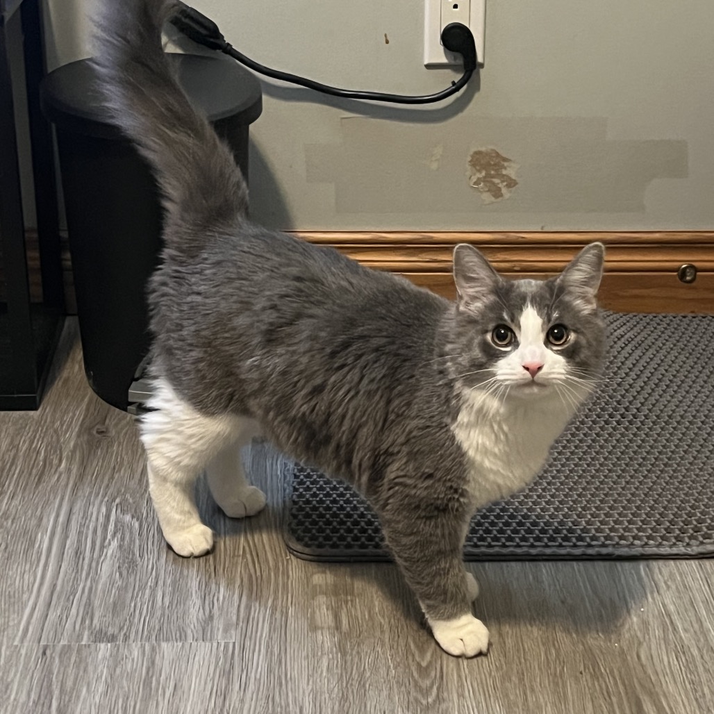 Mr. Grey is an irresistibly adorable kitten with a big personality and endless curiosity. Confident and fearless, he treats the world like his playground, exploring everything in sight with his signature feather-duster tail swaying behind him.