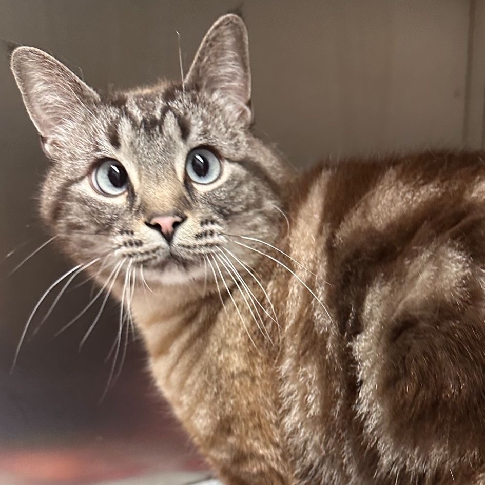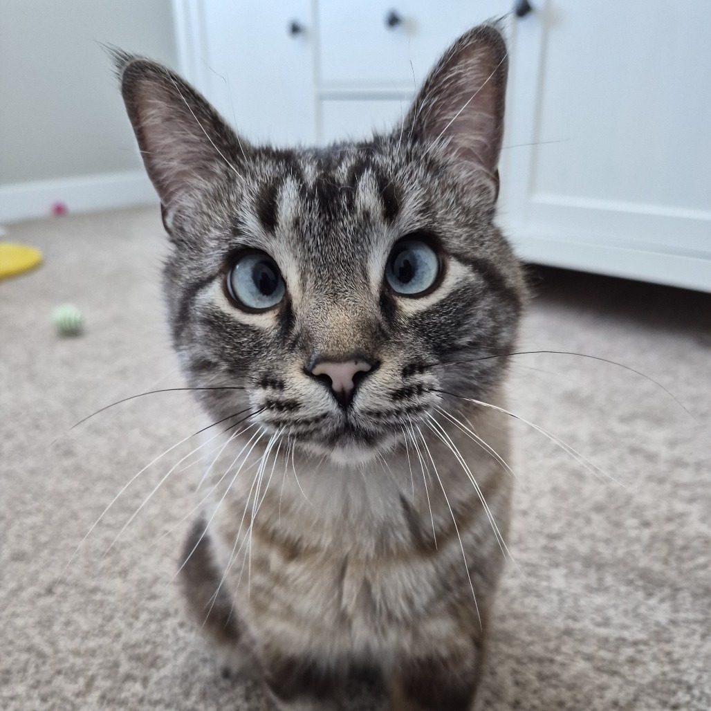 My name is spectacles! As you can tell I could probably use some spectacles with my slightly crossed eyes. My foster mom thinks it makes me look just adorable and I know how to work this to get more snacks!