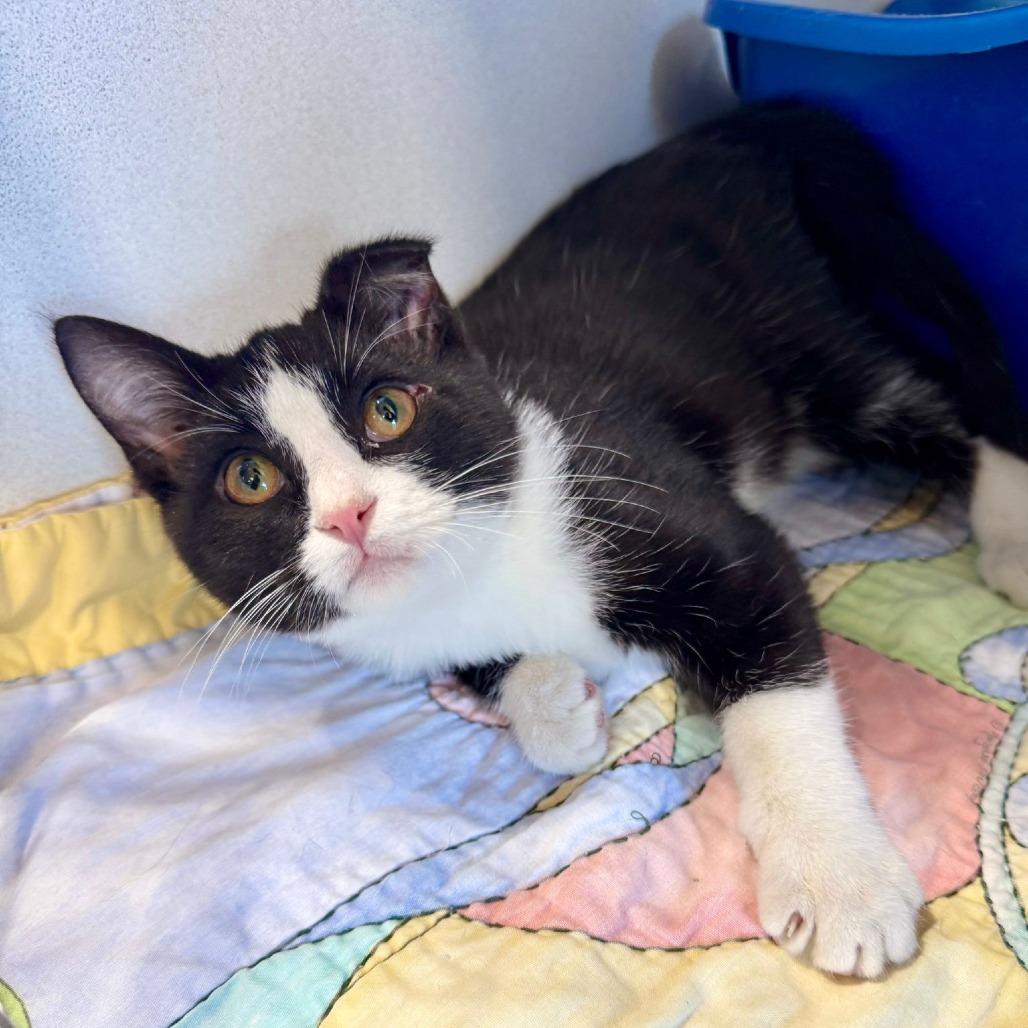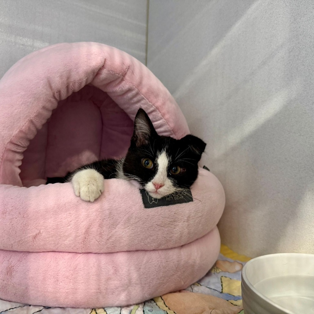 I’m an adorable tuxedo kitten who came into SCARS care by “magically” appearing, and after a trip to a vet to get checked out and fixed up, I was fortunate enough to land in a foster home. I’ve been getting plenty of love and attention while I heal. I’m somewhere around 4 months old, with plenty of energy and opinions. I love to snuggle with humans of all ages. I haven’t met the other cat here yet, but I’m so young that I’m sure I’ll be fine with