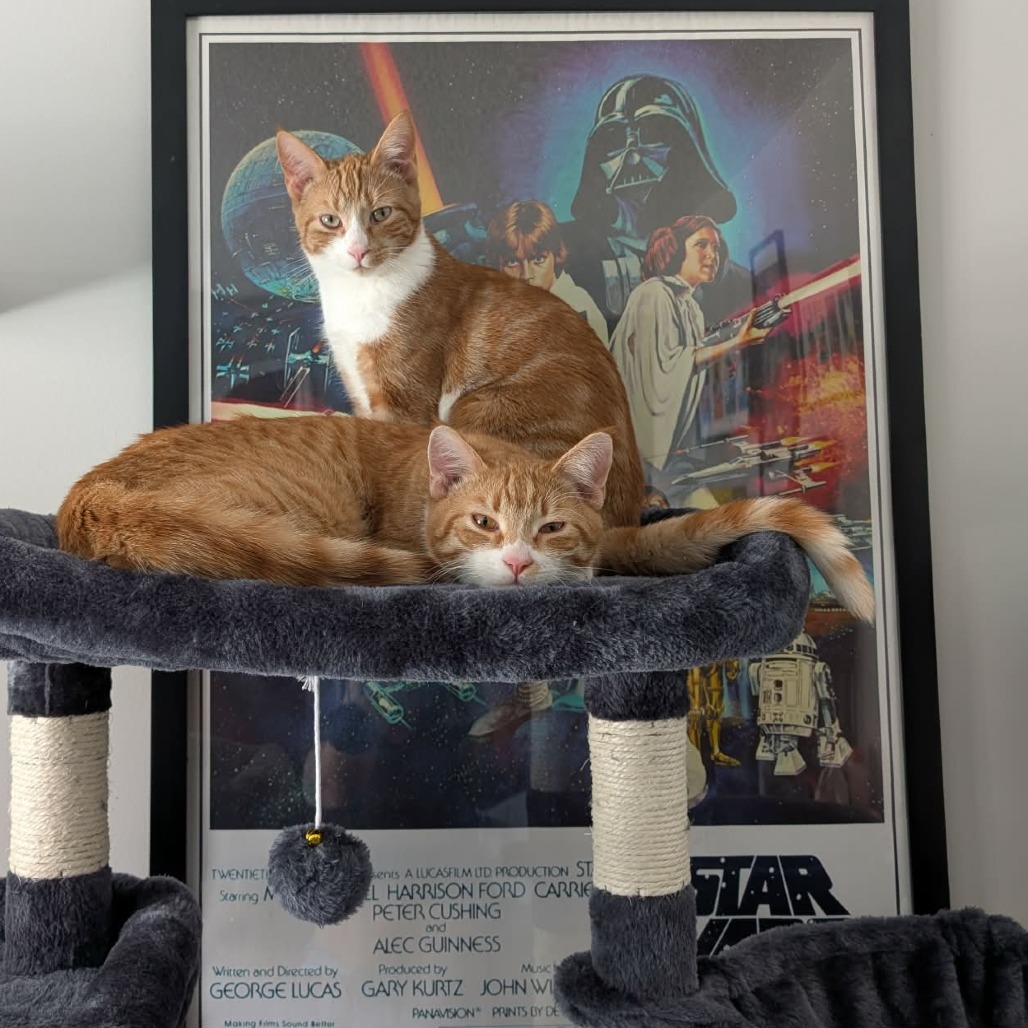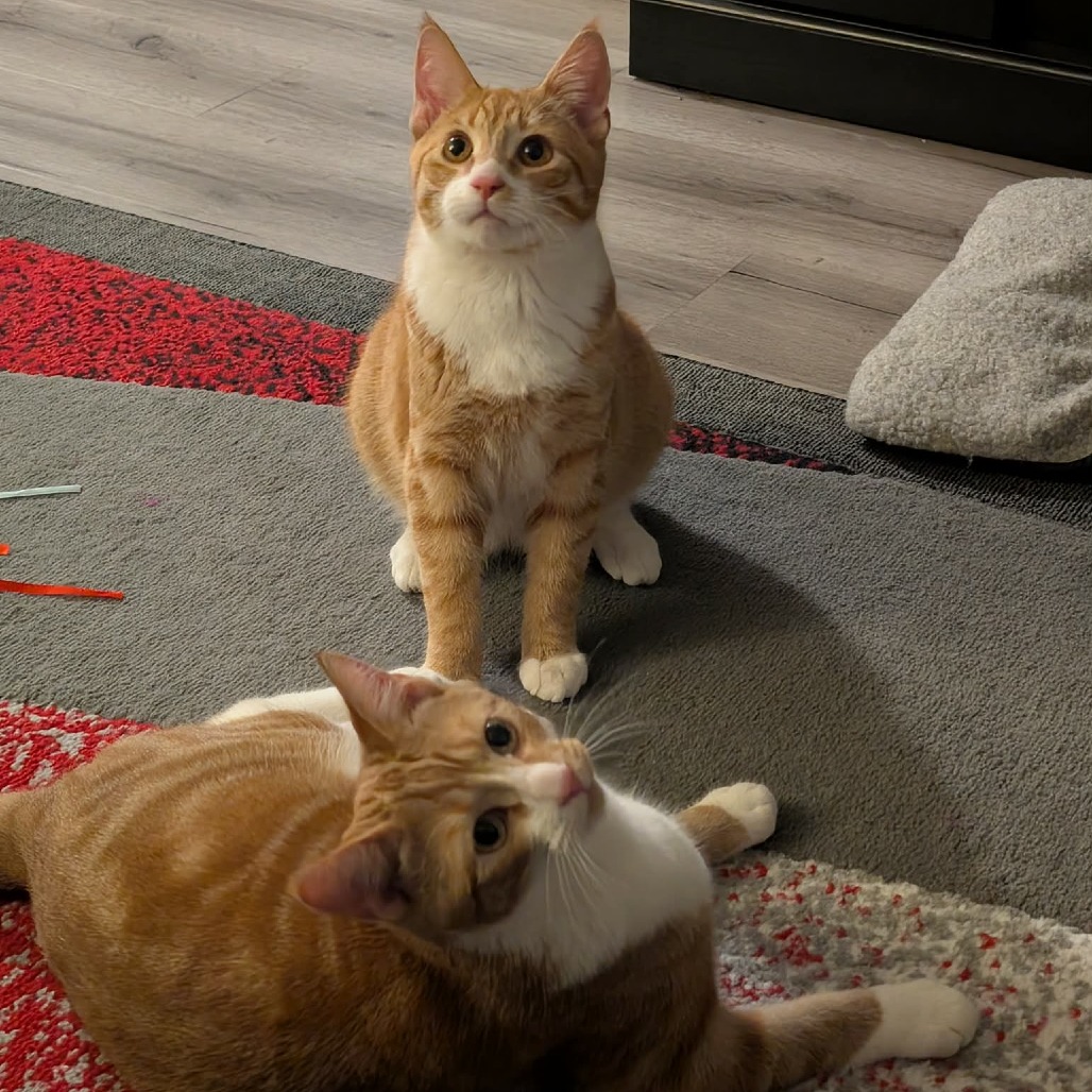 People sometimes ask how to tell us apart since we look so similar. I’m the one with the wider stripes, while Biscotti’s stripes are a little smaller and finer.