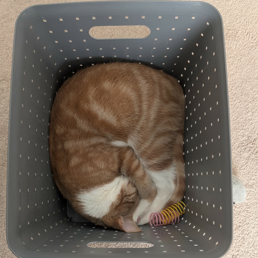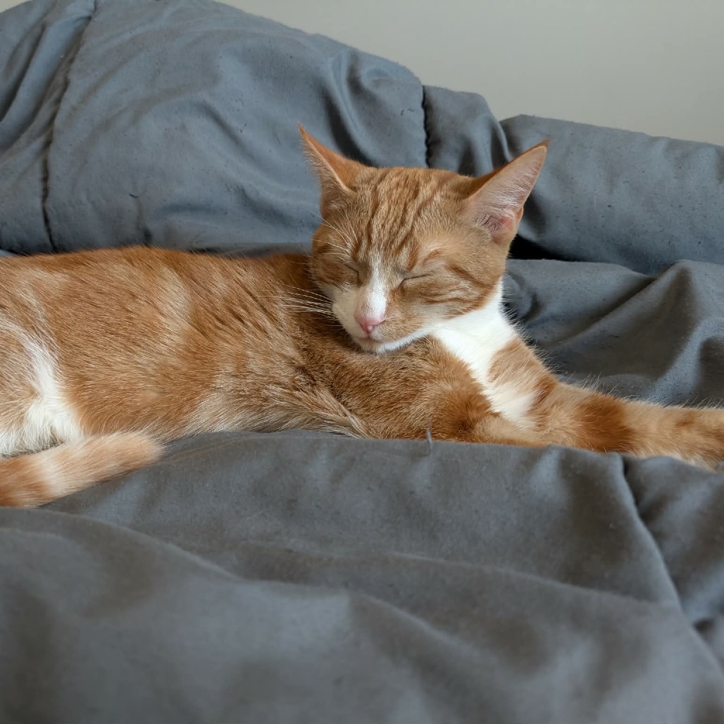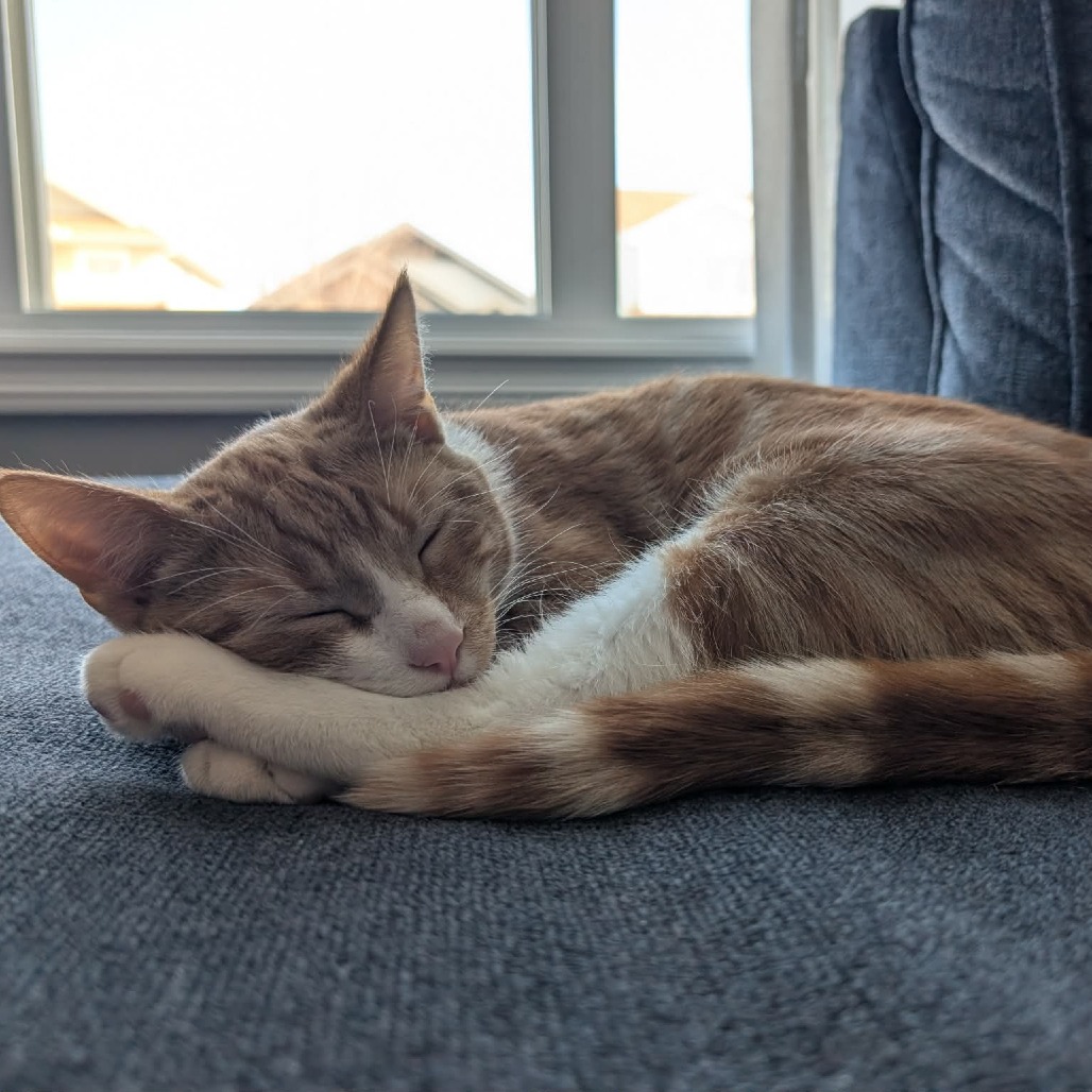 I’m a very affectionate cat who enjoys being close to my people. One of my favorite places to sleep is right in bed with my humans (usually with Biscotti nearby too). When I’m not cuddling, I enjoy playing and chasing Biscotti around the house. We have lots of fun together and keep each other entertained.