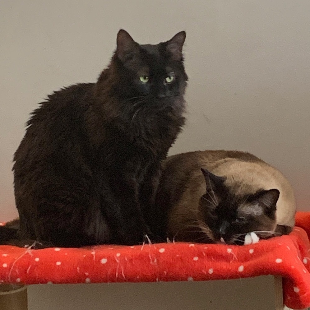 They have very different personalities. Tofu likes to talk, a lot. He’s outgoing, will follow you around. Mochi is timid. He will chirp and trill while playing but doesn’t really make a lot of noise Only in the last year has he been sleeping on the bed and coming on the couch. Mostly he sleeps in the top of cat towers or on a windowsill. So a home with kids over 10 would be best. Both are avid bird watchers.