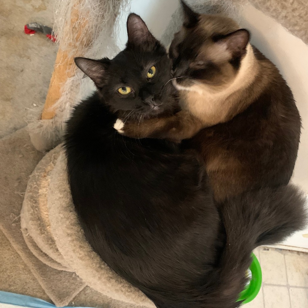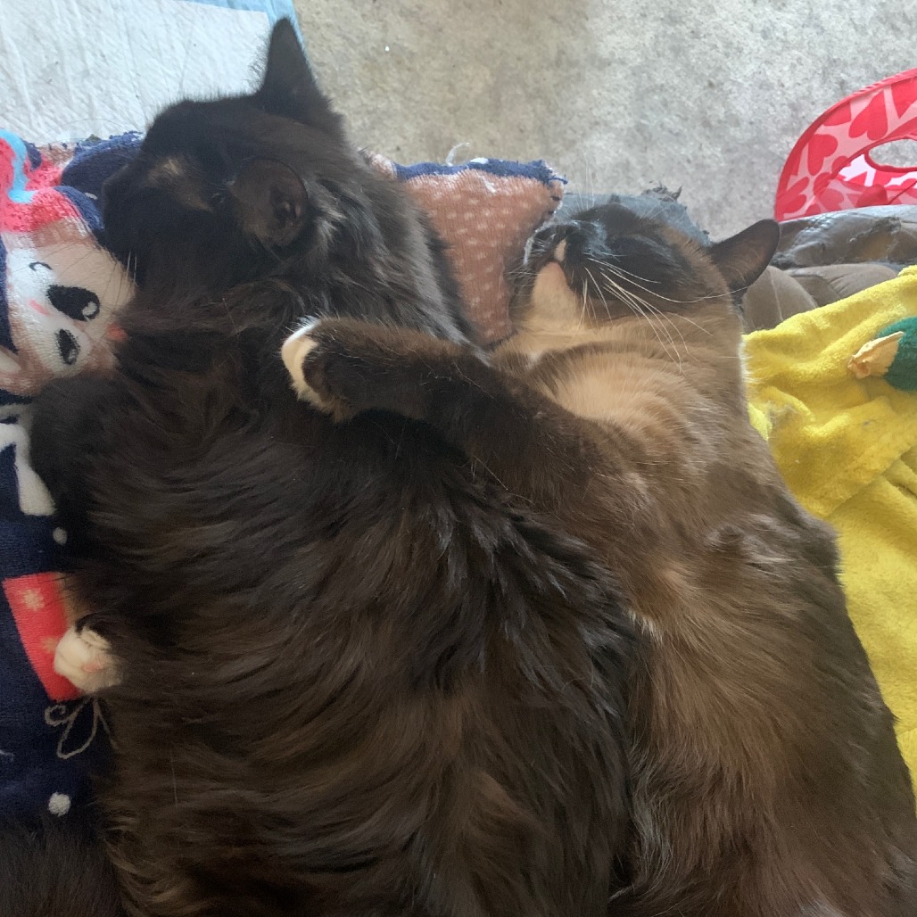 Tofu enjoys hugs and being picked up. Mochi would prefer to just be pet, and enjoys being brushed. Springs and foil balls are the go to play thing. Ribbons are also fun. They LOVE boxes!