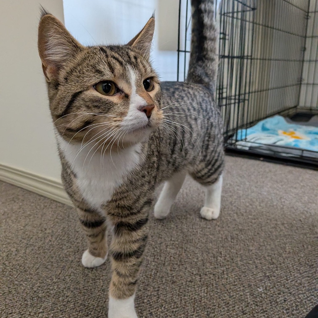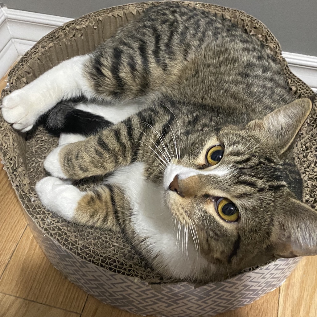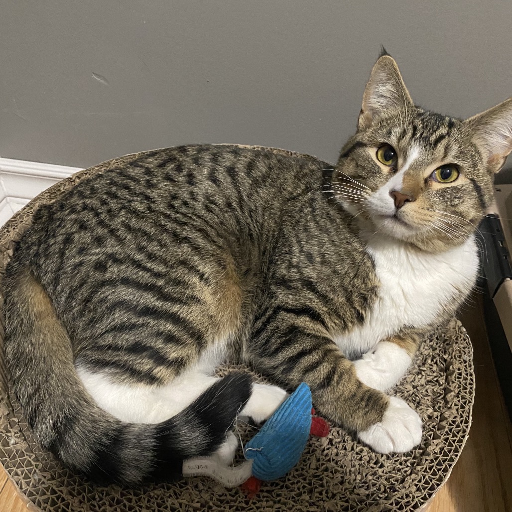 Hi, my name is Mulligan! I'm a young guy and probably still have some growing left to do. I'm well behaved for my age and am respectful in the house. I do have a lot of energy though, and would need a home that either has other energetic young cats or enough time to play with me and run all that off. I've been very gentle so far, and would likely be good with younger kids provided they're taught how to be gentle back. I like cuddling with my people, racing around chasing ghosts, playing with any and all toys, and especially the aquarium in my foster home. I could spend all day chasing the fish around! We're currently working on introductions with the older resident cats. So far I'm doing well, but every now and then I'll try and push the big male's boundaries. I should be able to be in a home with other cats (especially females or kittens), but, like all introductions, it will be important for us to take it slow. I'd also be happy solo, so long as my humans give me plenty of activity. Scars doesn't know if I've been around dogs before, but my foster home thinks I'd probably get along well with them, provided they're nice to me.