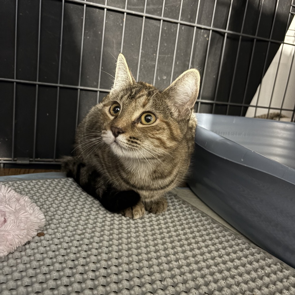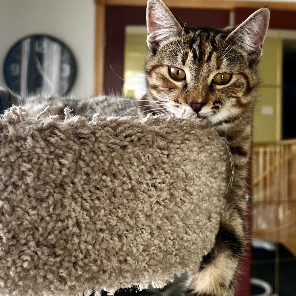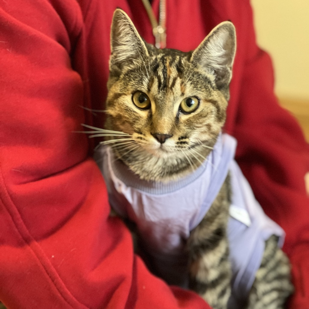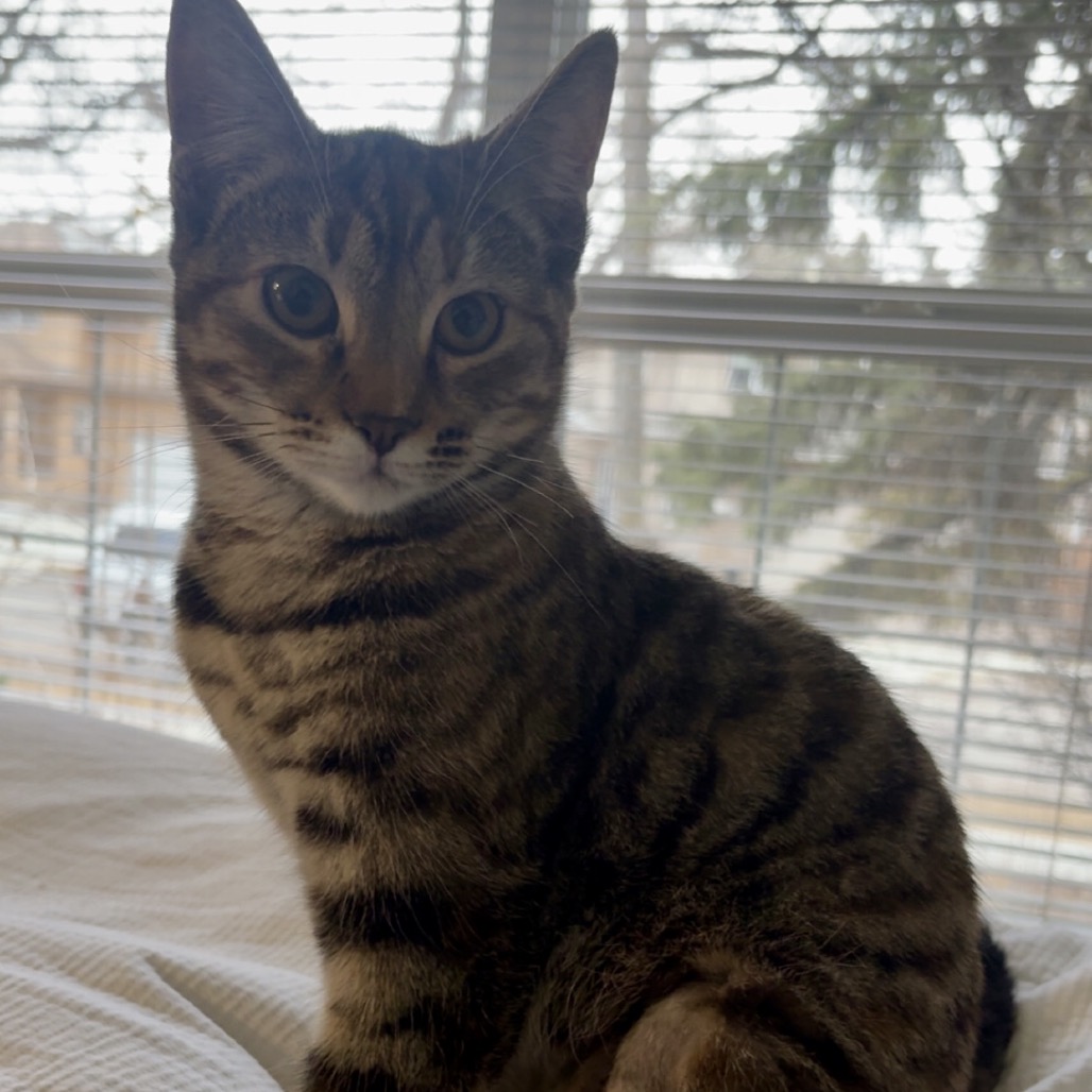 The vet fixed up the big bite I had on my leg, and I have recovered really well in my foster hone. Foster mom says pictures don’t do me justice! I am a little tabby with lots of pretty orange stripes mixed in with all the other colours. I am not yet full grown. But even better than my good looks is my great purrsonality! I love people! I like to hang out with my foster family and am excellent at supervising all computer and laundry work. I have a gentle and sweet nature.