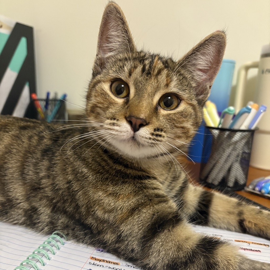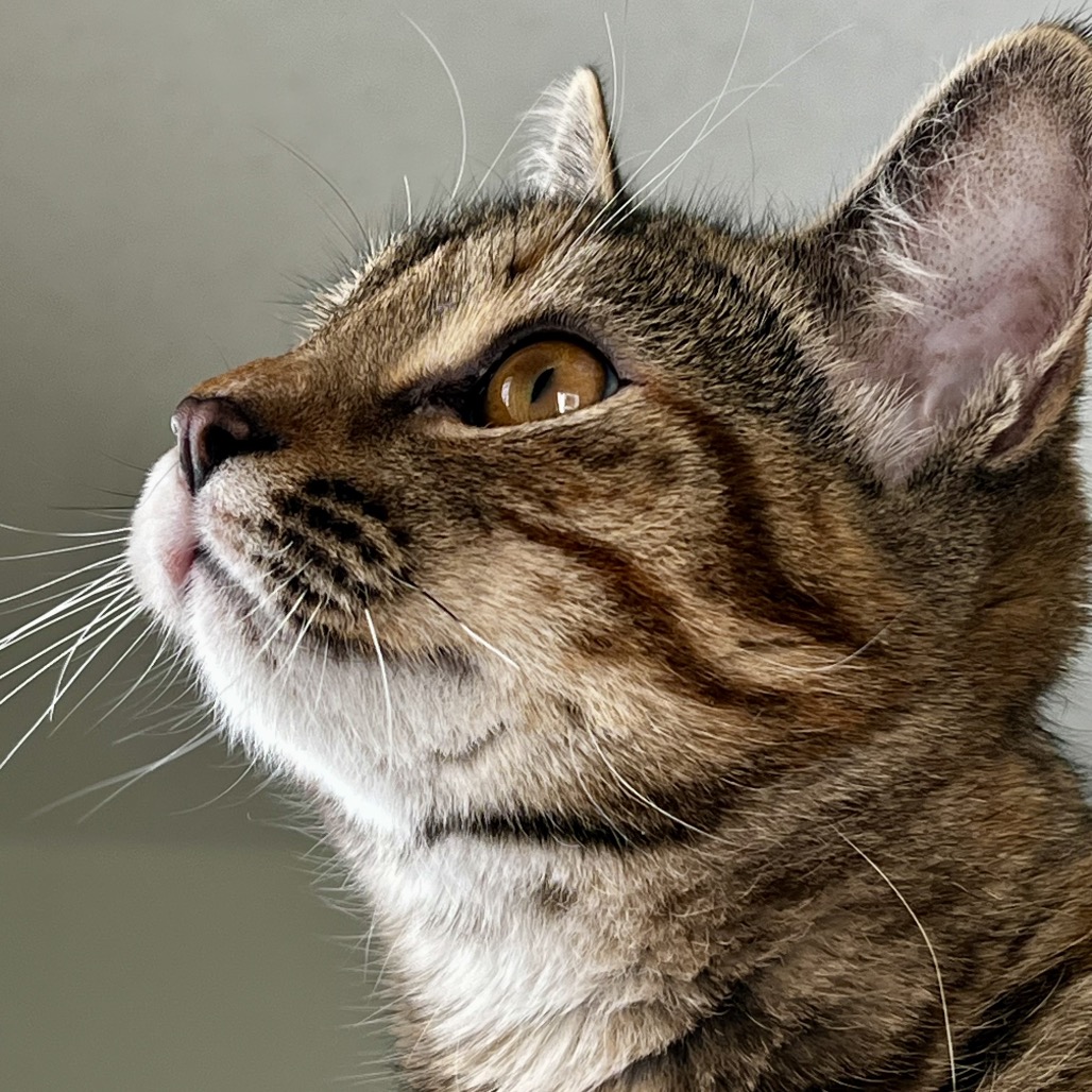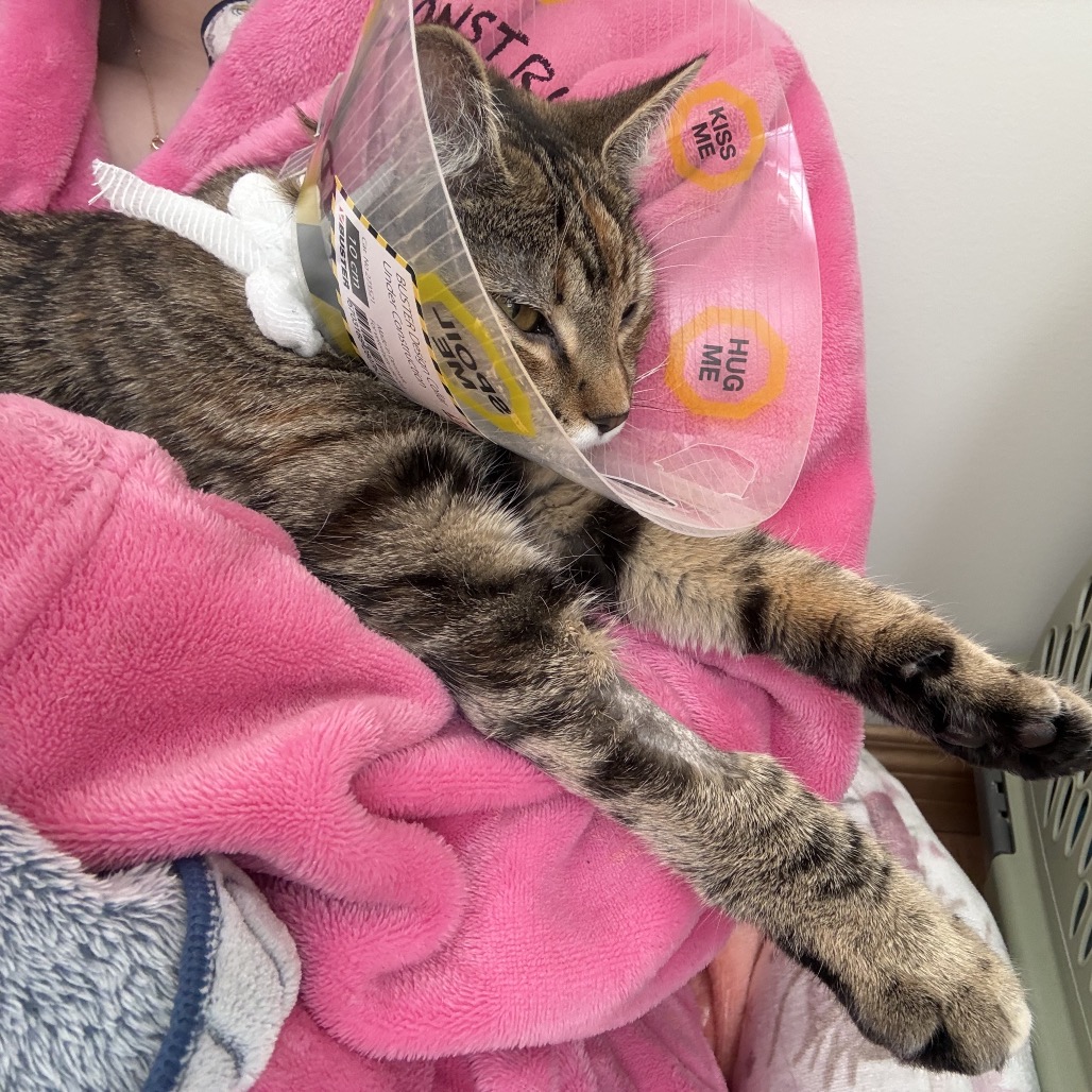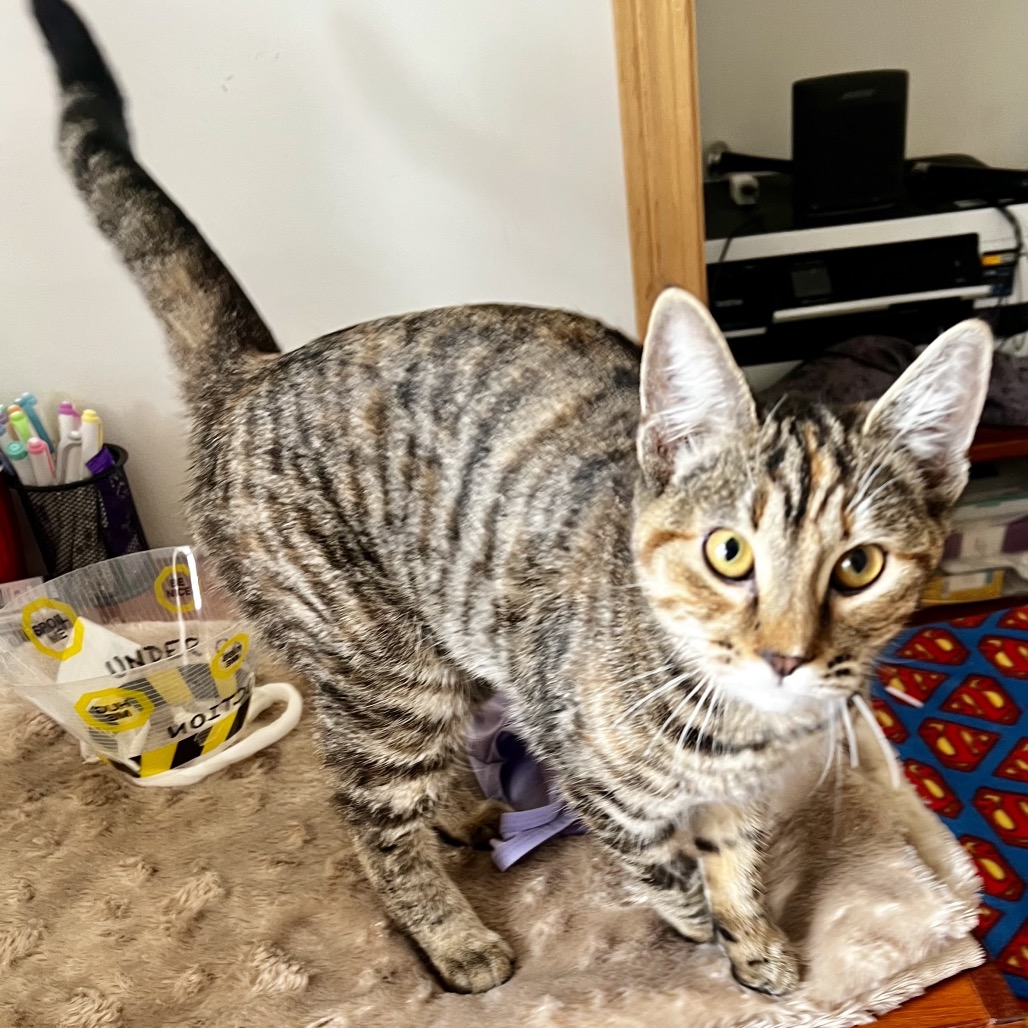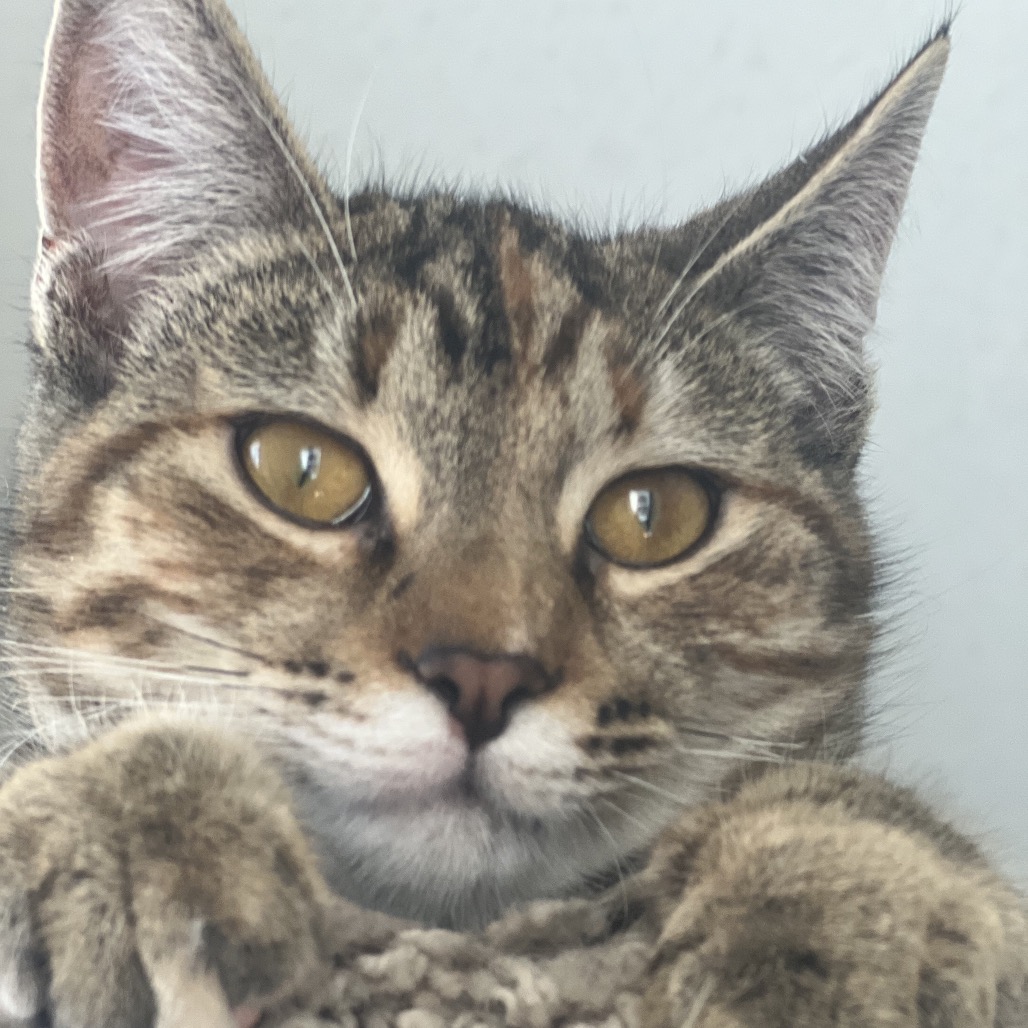 The vet fixed up the big bite I had on my leg, and I have recovered really well in my foster hone. Foster mom says pictures don’t do me justice! I am a little tabby with lots of pretty orange stripes mixed in with all the other colours. I am not yet full grown. But even better than my good looks is my great purrsonality! I love people! I like to hang out with my foster family and am excellent at supervising all computer and laundry work. I have a gentle and sweet nature.