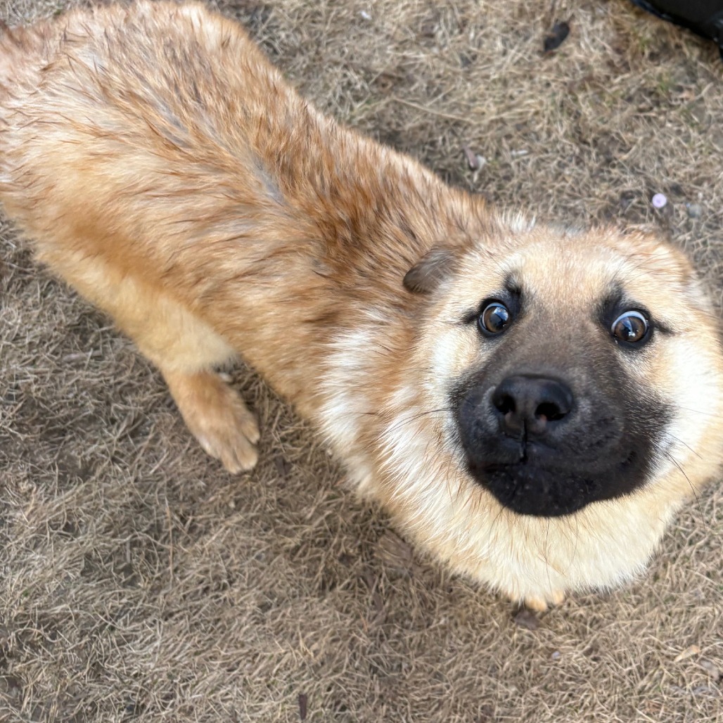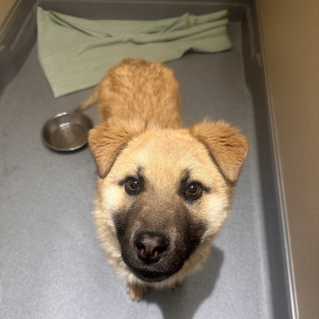 He’s a high-energy, social puppy who gets excited around people and other dogs, and will benefit from continued guidance to build calm, polite manners. He’s very food motivated and eager to learn, making training a great bonding opportunity. He’s doing well with crate training and is still learning the basics of house training.